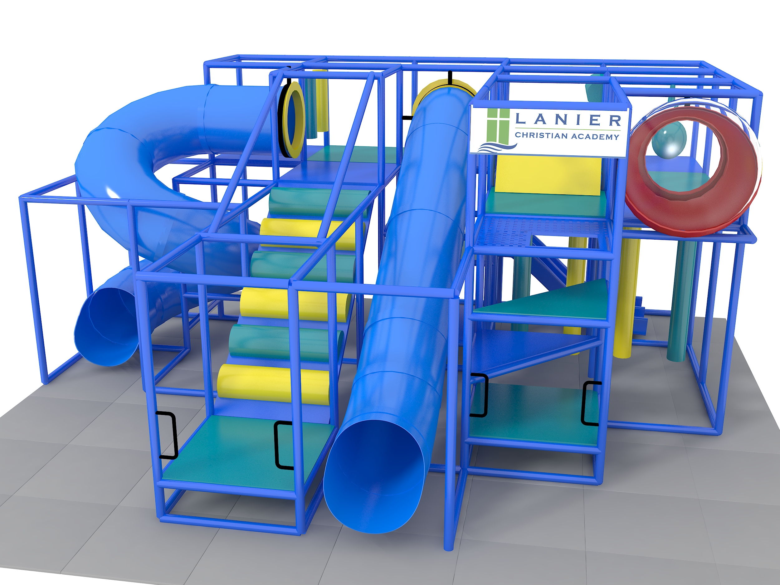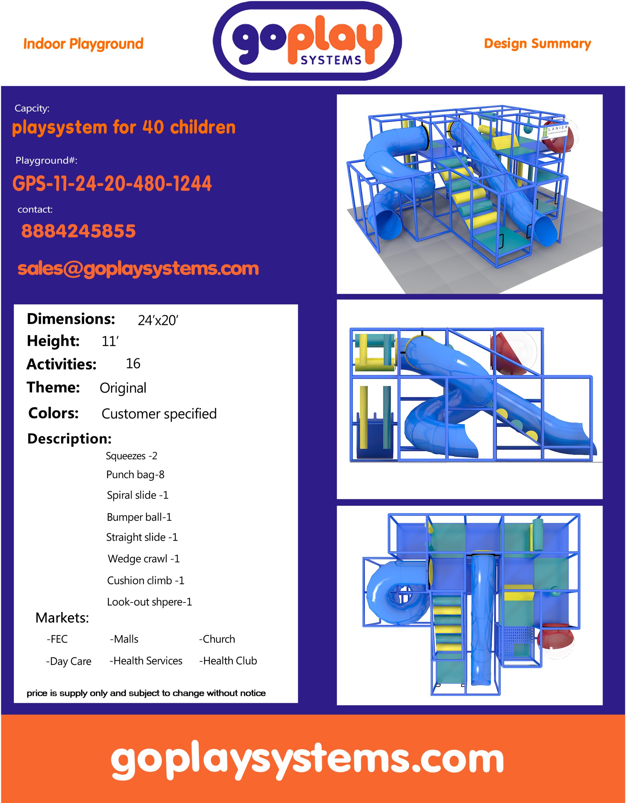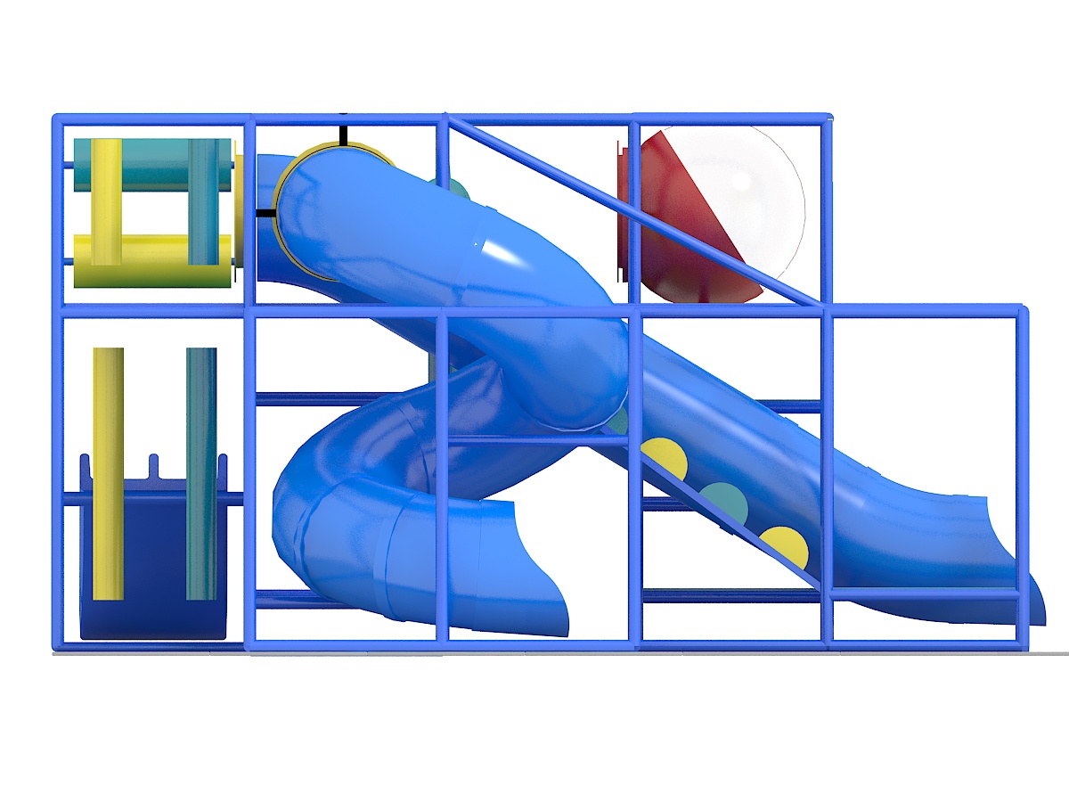 O parque infantil coberto GPS1244 é um sistema de recreação coberto personalizado para crianças de três a doze anos. A unidade de recreação com piso macio mede 7,3 m de largura por 3,3 m de altura e 6,1 m de comprimento. O espaço mínimo necessário para este equipamento de recreação infantil é de aproximadamente 9,1 m de largura, com pé-direito de 4,9 m e 8,9 m de comprimento. Área total: 45,7 m². Parque infantil coberto de tamanho médio.
