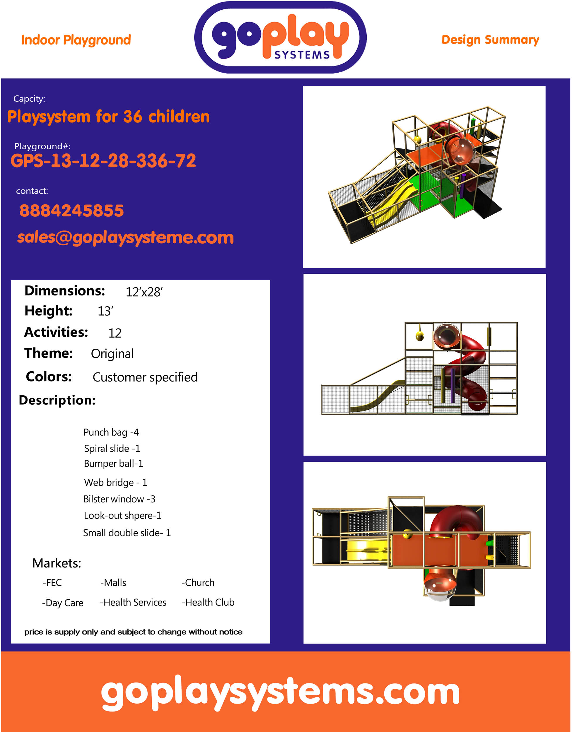 O parque infantil coberto GPS72 é um parque infantil modular com piso macio, projetado sob medida, para crianças de três a doze anos. O sistema de brincadeiras interno mede 3,6 m de largura por 4,9 m de altura e 8,5 m de comprimento. O espaço mínimo necessário para este parque infantil interno é de aproximadamente 5,5 m de largura, com pé-direito de 4,5 m e 10,3 m de comprimento. Parque infantil interno de tamanho médio.