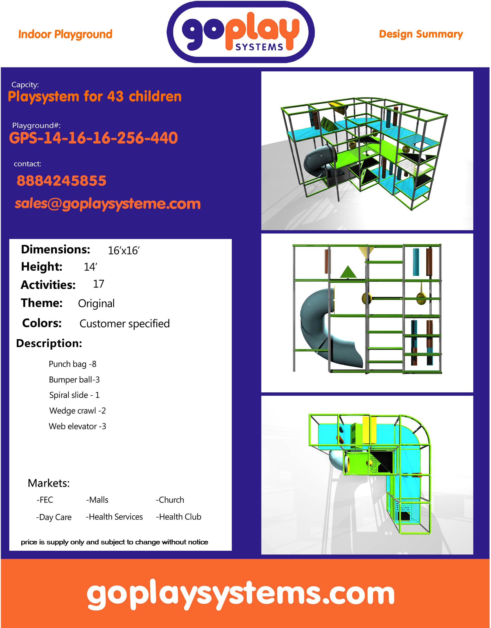 O parque infantil coberto GPS440 é uma unidade de recreação com piso macio, projetada especificamente para crianças de três a doze anos. O sistema de brincadeiras coberto mede 4,8 m de largura por 4,2 m de altura e 4,8 m de comprimento. O espaço mínimo necessário para este parque infantil coberto é de aproximadamente 6,7 m de largura, 4,8 m de altura e 6,7 m de comprimento. Parque infantil coberto de tamanho médio.