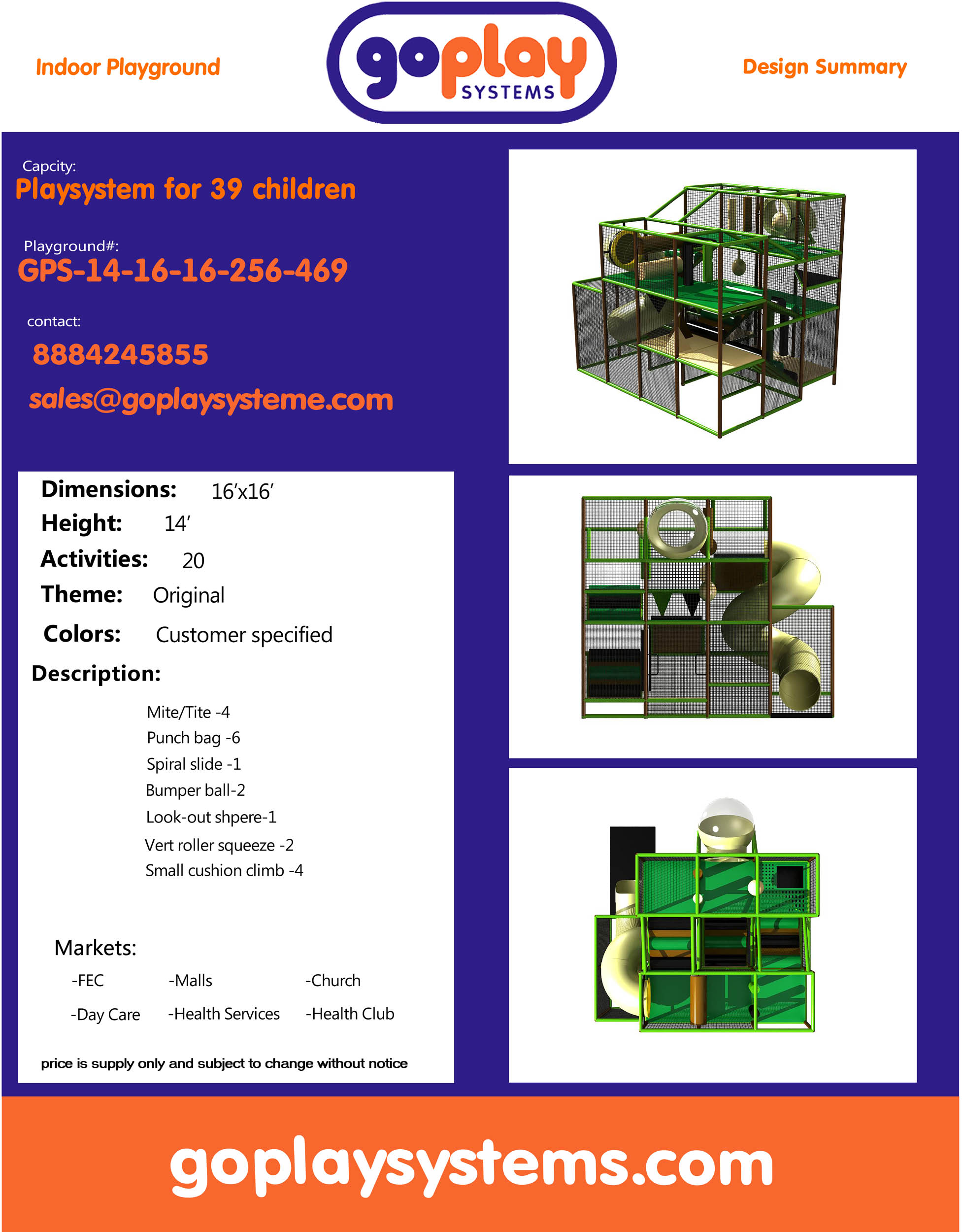O parque infantil interno GPS469 é um parque infantil modular com piso macio, projetado sob medida, para crianças de três a doze anos. O sistema de brincadeiras interno mede 4,8 m de largura por 4,2 m de altura e 4,8 m de comprimento. O espaço mínimo necessário para este parque infantil interno é de aproximadamente 6,7 m de largura, 4,8 m de altura e 6,7 m de comprimento. Parque infantil interno de tamanho médio.