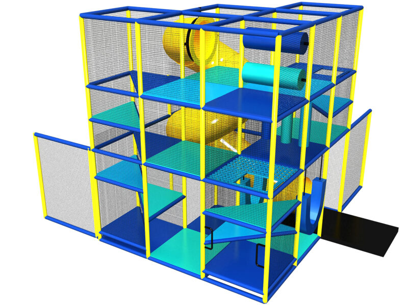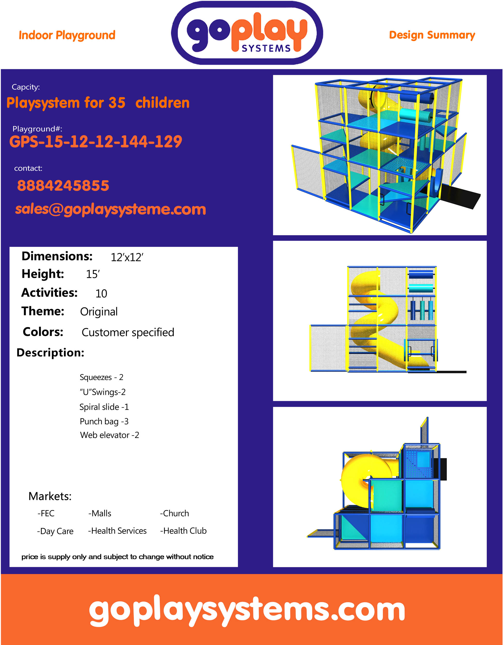 O parque infantil interno GPS129 é um parque infantil modular com piso macio, projetado sob medida, para crianças de três a doze anos. O sistema de brincadeiras interno mede 3,6 m de largura por 4,5 m de altura e 3,6 m de comprimento. O espaço mínimo necessário para este parque infantil interno é de aproximadamente 5,5 m de largura, 5,2 m de altura e 5,5 m de comprimento. Parque infantil interno de tamanho médio.