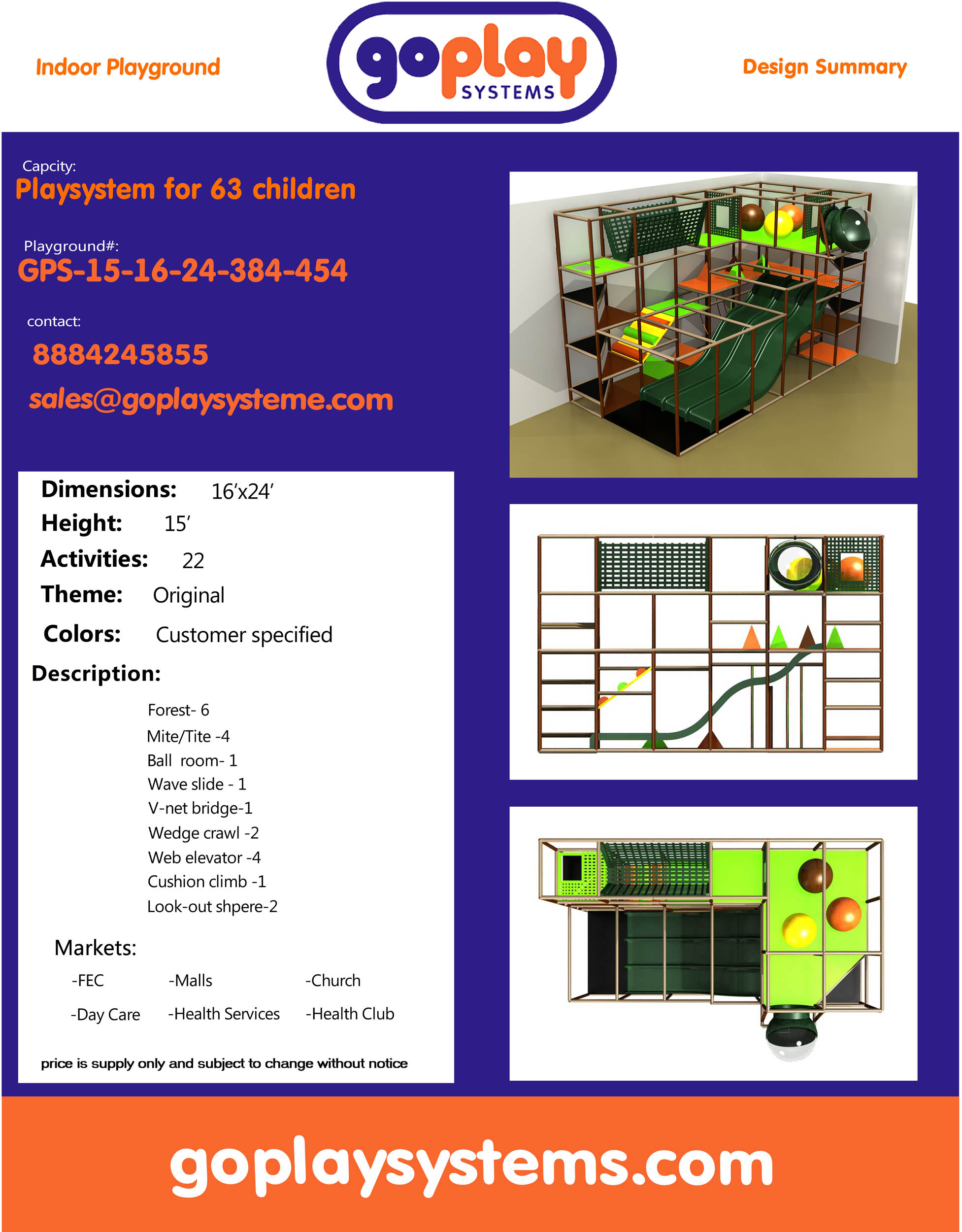 O parque infantil coberto GPS454 é um parque infantil modular com piso macio, projetado sob medida, para crianças de três a doze anos. O sistema de brincadeiras interno mede 4,8 m de largura por 4,5 m de altura e 7,3 m de comprimento. O espaço mínimo necessário para este parque infantil interno é de aproximadamente 6,7 m de largura, 5,2 m de altura e 9,1 m de comprimento. O parque infantil interno de tamanho médio.