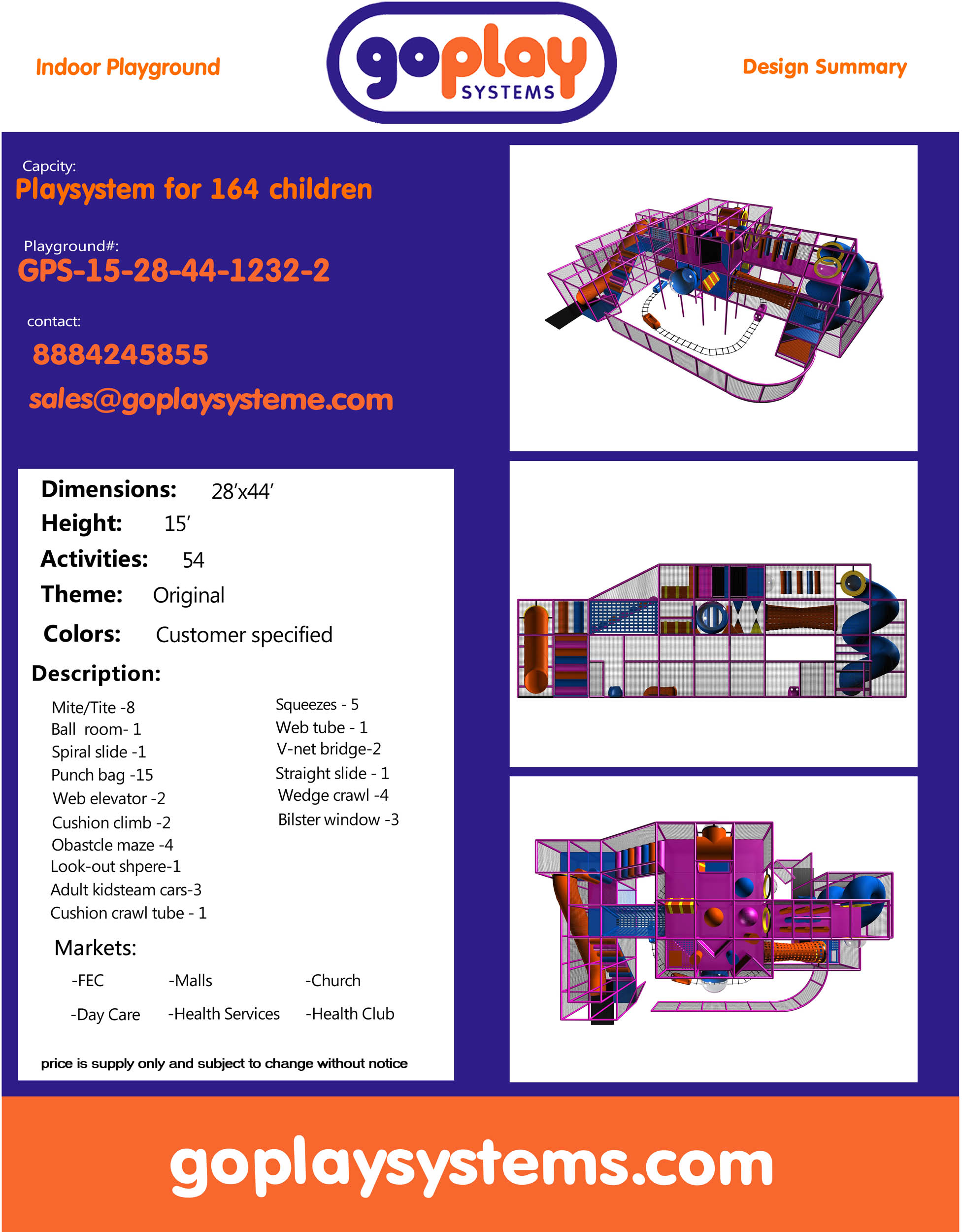 O parque infantil coberto GPS2 é um sistema de recreação coberto feito sob medida para crianças de três a doze anos. A área de recreação macia mede 8,5 m de largura por 4,5 m de altura e 13,4 m de comprimento. O espaço mínimo necessário para este parque infantil coberto é de aproximadamente 10,3 m de largura, com pé-direito de 5,2 m e 15,2 m de comprimento. Parque infantil coberto de tamanho médio.