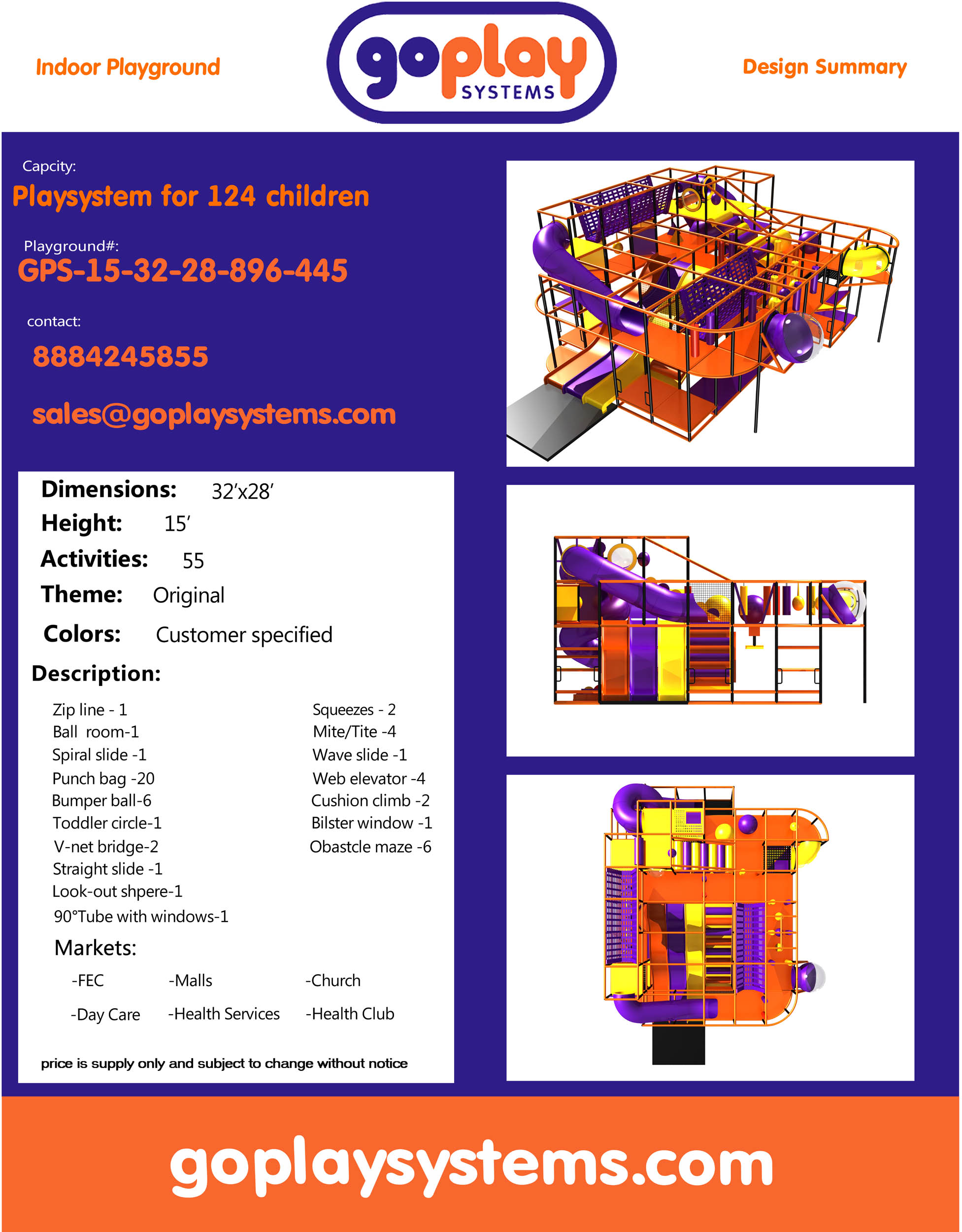 O parque infantil interno GPS445 é um sistema de recreação interno feito sob medida para crianças de três a doze anos. A área de recreação macia mede 9,7 m de largura por 4,5 m de altura e 8,5 m de comprimento. O espaço mínimo necessário para este parque infantil coberto é de aproximadamente 11,5 m de largura, com pé-direito de 5,2 m e 10,3 m de comprimento. Parque infantil coberto de tamanho médio.