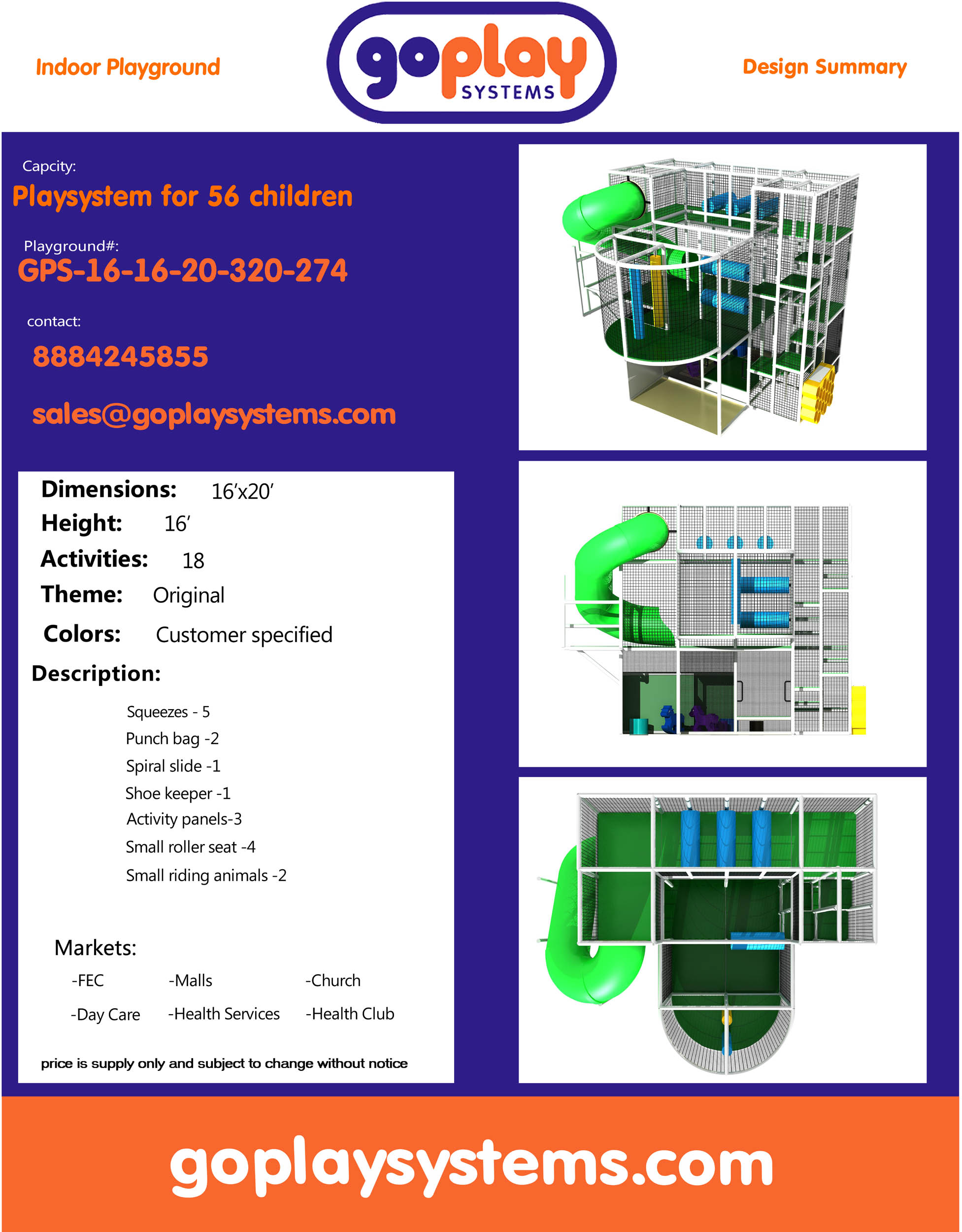 O parque infantil coberto GPS274 é um sistema de recreação coberto feito sob medida para crianças de três a doze anos. A área de recreação com piso macio mede 4,8 m de largura por 4,8 m de altura e 6,1 m de comprimento. O espaço mínimo necessário para este parque infantil coberto é de aproximadamente 6,7 m de largura, 5,5 m de altura e 8,9 m de comprimento. Parque infantil coberto de tamanho médio.
