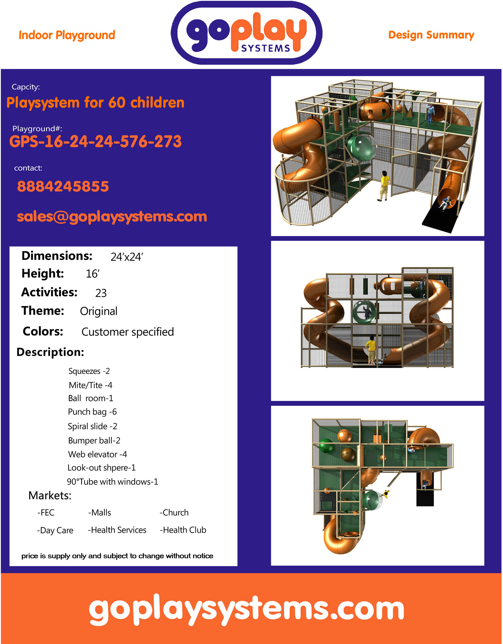 O parque infantil interno GPS273 é um sistema de recreação interno feito sob medida para crianças de três a doze anos. A área de recreação macia mede 7,3 m de largura por 4,8 m de altura e 7,3 m de comprimento. O espaço mínimo necessário para este parque infantil interno é de aproximadamente 9,1 m de largura, com pé-direito de 5,5 m e 9,1 m de comprimento. Parque infantil interno de tamanho médio.