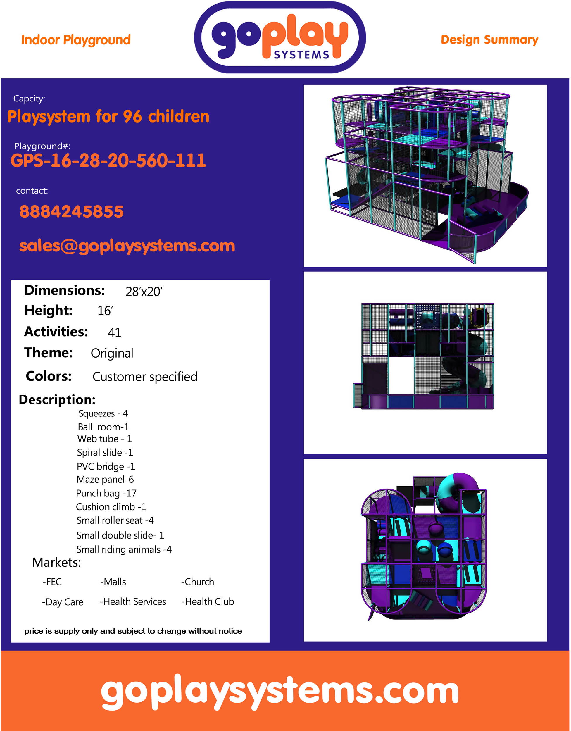 O parque infantil interno GPS111 é um sistema de recreação interno personalizado para crianças de três a doze anos. A área de recreação macia mede 8,5 m de largura por 4,8 m de altura e 6,1 m de comprimento. O espaço mínimo necessário para este parque infantil coberto é de aproximadamente 10,3 m de largura, 5,5 m de altura e 8,9 m de comprimento. Parque infantil coberto de tamanho médio.