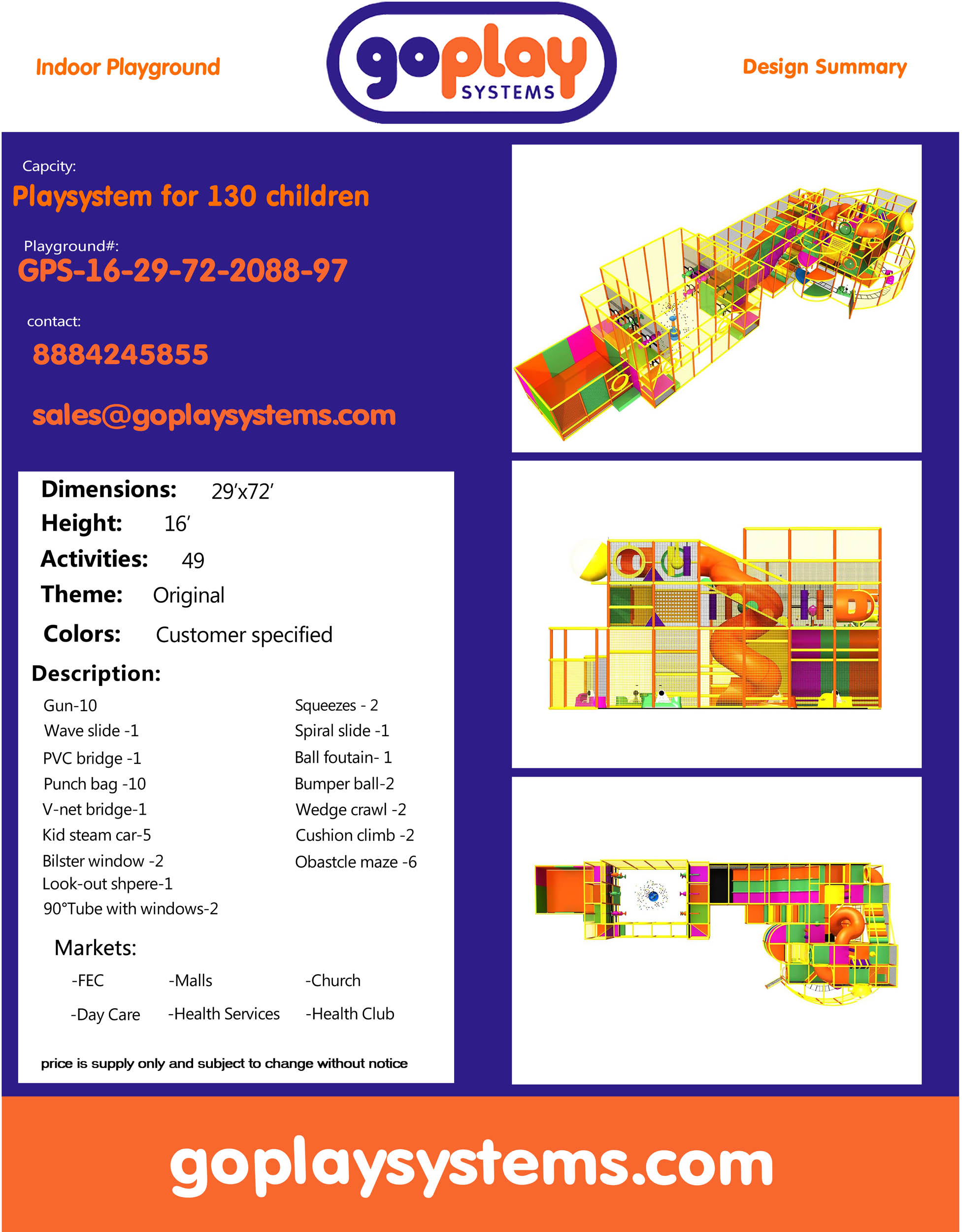 O parque infantil coberto GPS97 é um sistema de recreação coberto feito sob medida para crianças de três a doze anos. A área de recreação macia mede 9,8 m de largura por 4,8 m de altura e 22,8 m de comprimento. O espaço mínimo necessário para este parque infantil coberto é de aproximadamente 10,6 m de largura, com pé-direito de 5,5 m e 24,7 m de comprimento. Parque infantil coberto de tamanho médio.