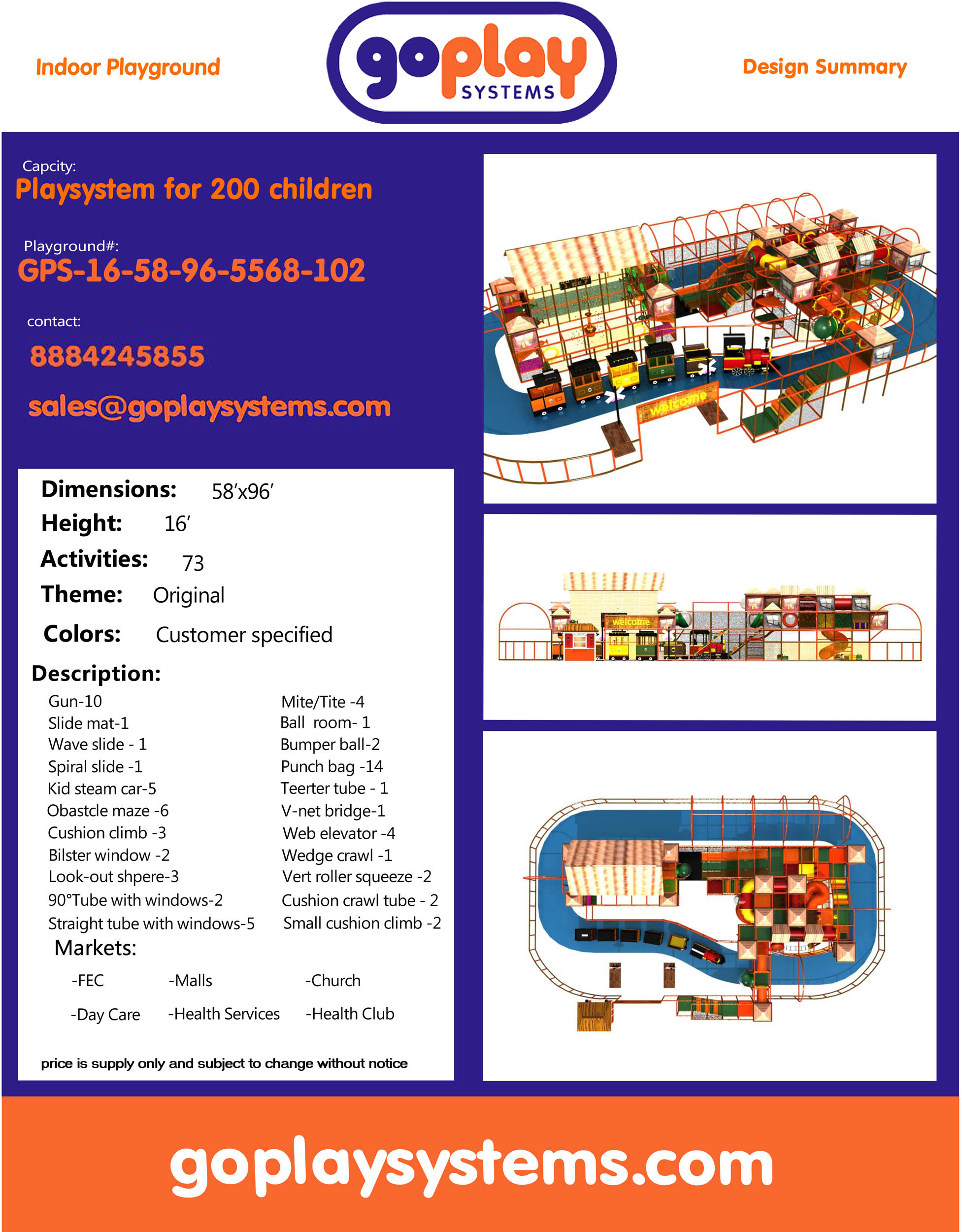 O parque infantil coberto GPS102 é um sistema de recreação coberto feito sob medida para crianças de três a doze anos. A área de recreação macia mede 17,5 m de largura por 4,8 m de altura e 29,4 m de comprimento. O espaço mínimo necessário para este parque infantil coberto é de aproximadamente 19,4 m de largura, com pé-direito de 5,5 m e 30,5 m de comprimento. Dimensões do parque infantil coberto.