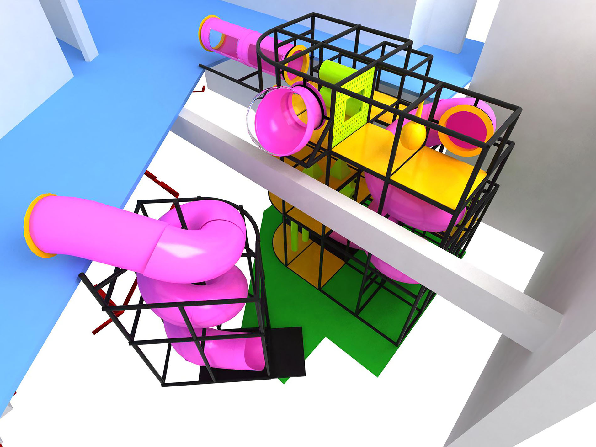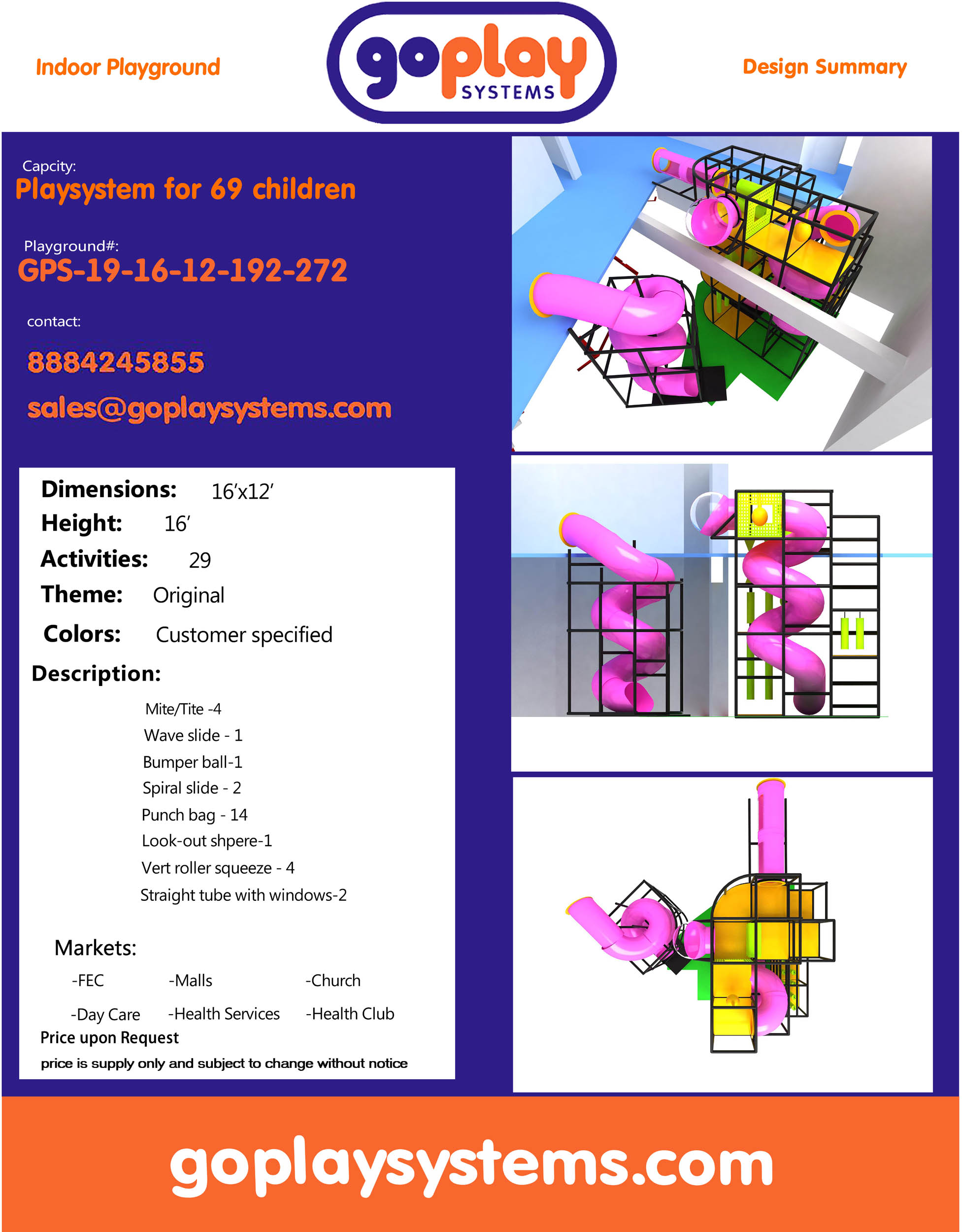 O parque infantil interno GPS272 é um sistema de recreação interno feito sob medida para crianças de três a doze anos. A área de recreação macia mede 4,8 m de largura por 5,8 m de altura e 3,6 m de comprimento. O espaço mínimo necessário para este parque infantil interno é de aproximadamente 6,7 m de largura, 6,4 m de altura e 5,4 m de comprimento. Parque infantil interno de tamanho médio. Este parque infantil é ideal para edifícios ou armazéns com tetos altos.