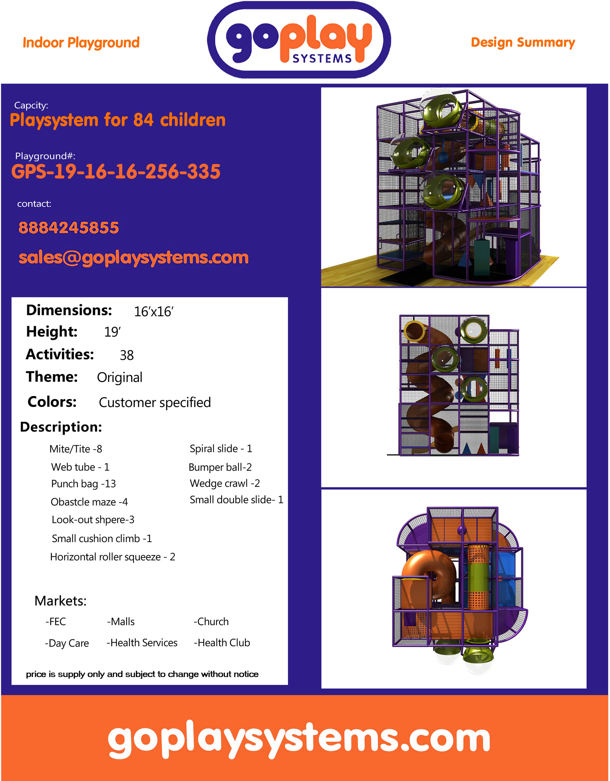 O parque infantil interno GPS335 é um sistema de recreação interno feito sob medida para crianças de três a doze anos. A área de recreação macia mede 4,8 m de largura por 5,8 m de altura e 4,8 m de comprimento. O espaço mínimo necessário para este parque infantil interno é de aproximadamente 6,7 m de largura, 6,4 m de altura e 6,7 m de comprimento. Parque infantil interno de tamanho médio. Este parque infantil é ideal para edifícios ou armazéns com tetos altos.
