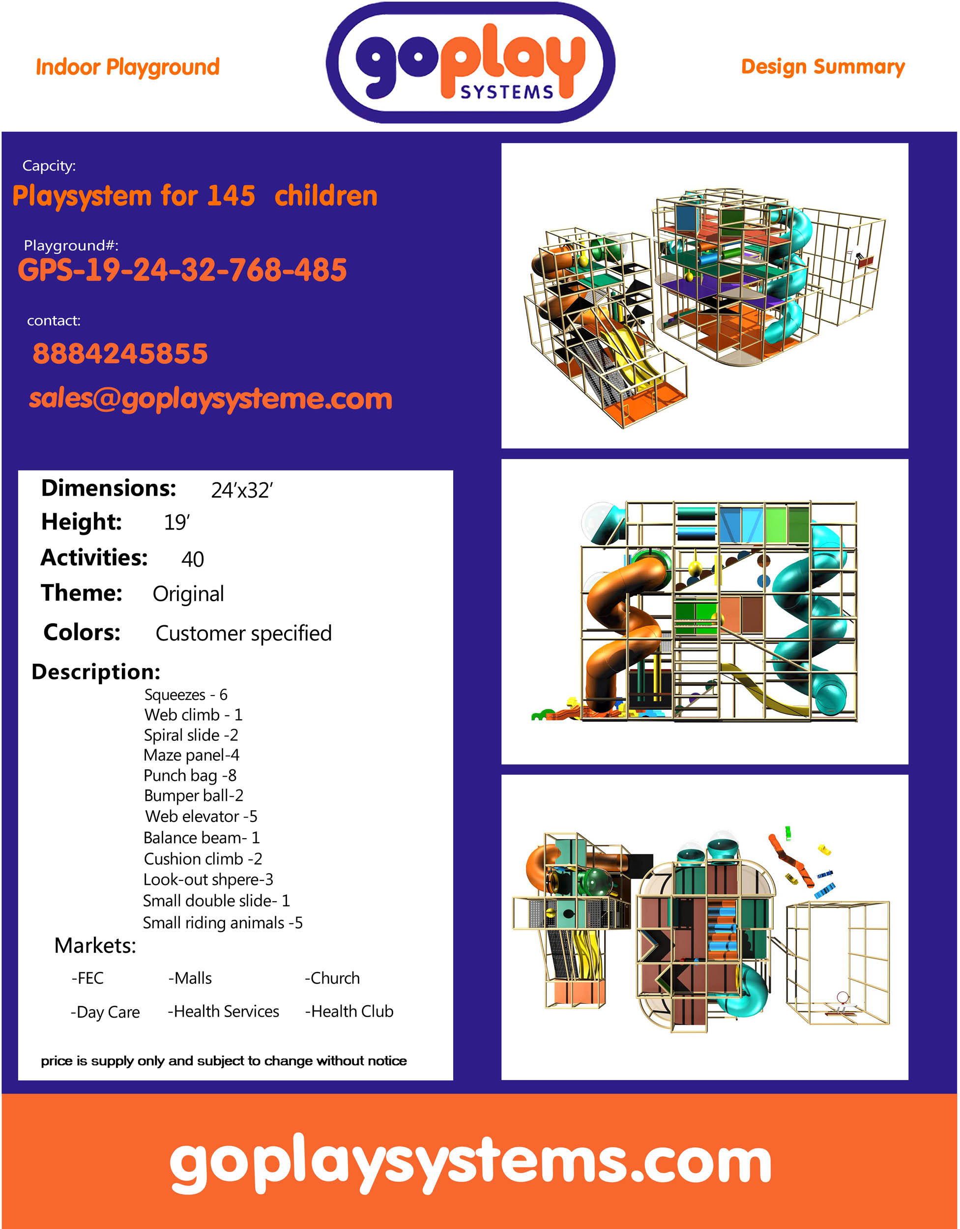 O parque infantil coberto GPS485 é um sistema de recreação coberto feito sob medida para crianças de três a doze anos. A área de recreação macia mede 7,3 m de largura por 5,8 m de altura e 9,7 m de comprimento. O espaço mínimo necessário para este parque infantil interno é de aproximadamente 9,1 m de largura, 6,4 m de altura e 11,5 m de comprimento. Parque infantil interno de tamanho médio. Este parque infantil é ideal para edifícios ou armazéns com tetos altos.