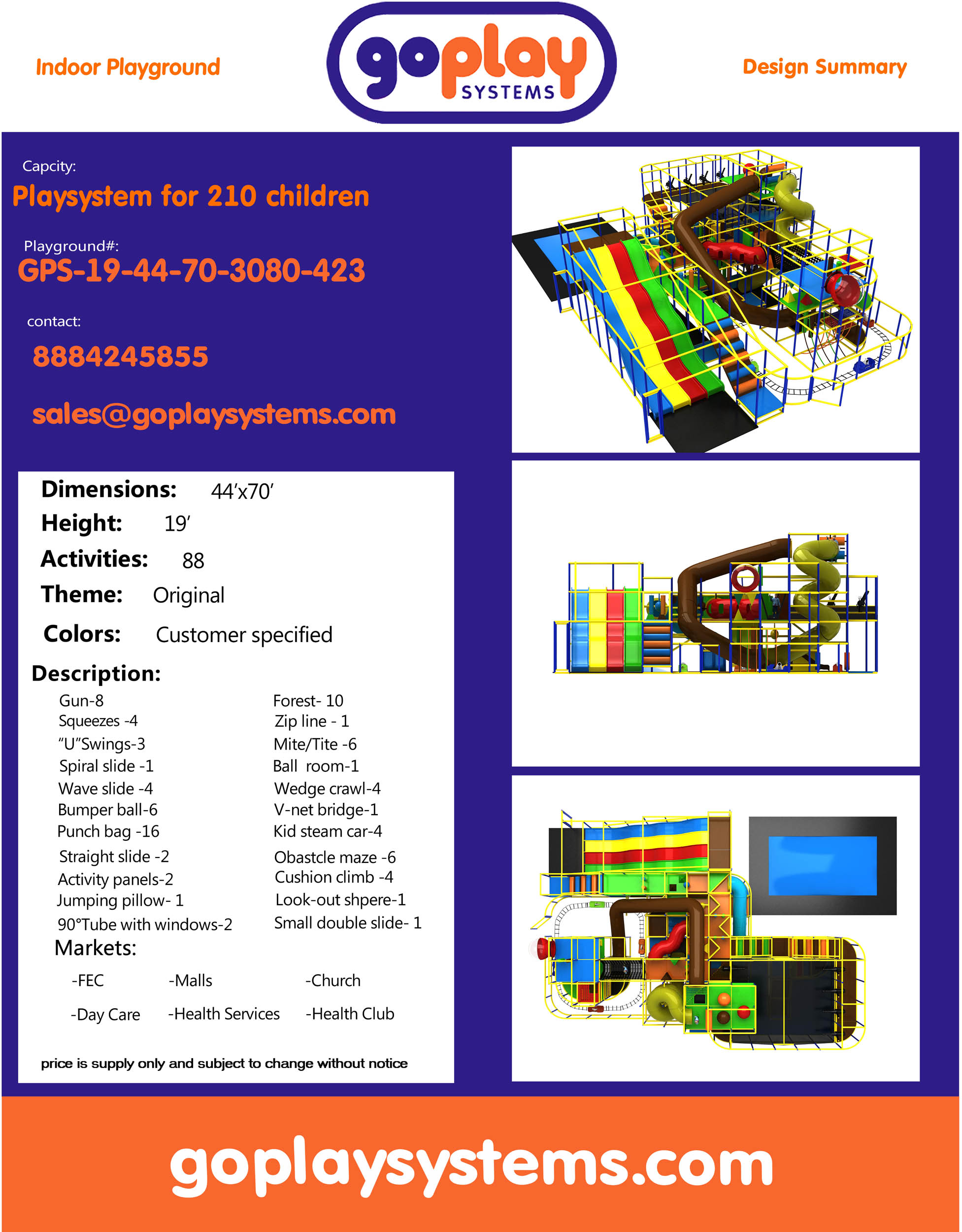 O parque infantil coberto GPS423 é um sistema de recreação coberto feito sob medida para crianças de três a doze anos. A área de recreação macia mede 13,4 m de largura por 5,8 m de altura e 21,3 m de comprimento. O espaço mínimo necessário para este parque infantil coberto é de aproximadamente 15,2 m de largura, com pé-direito de 6,4 m e 23,9 m de comprimento. Parque infantil coberto de grandes dimensões. Este parque infantil é ideal para edifícios ou armazéns com pé-direito alto.