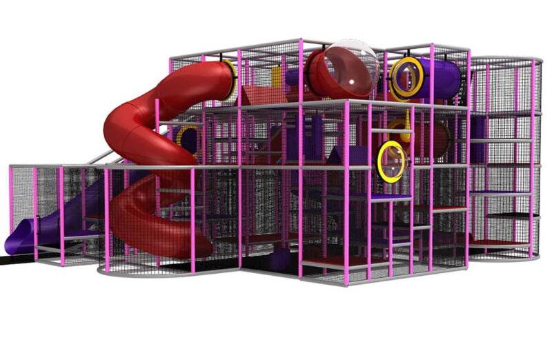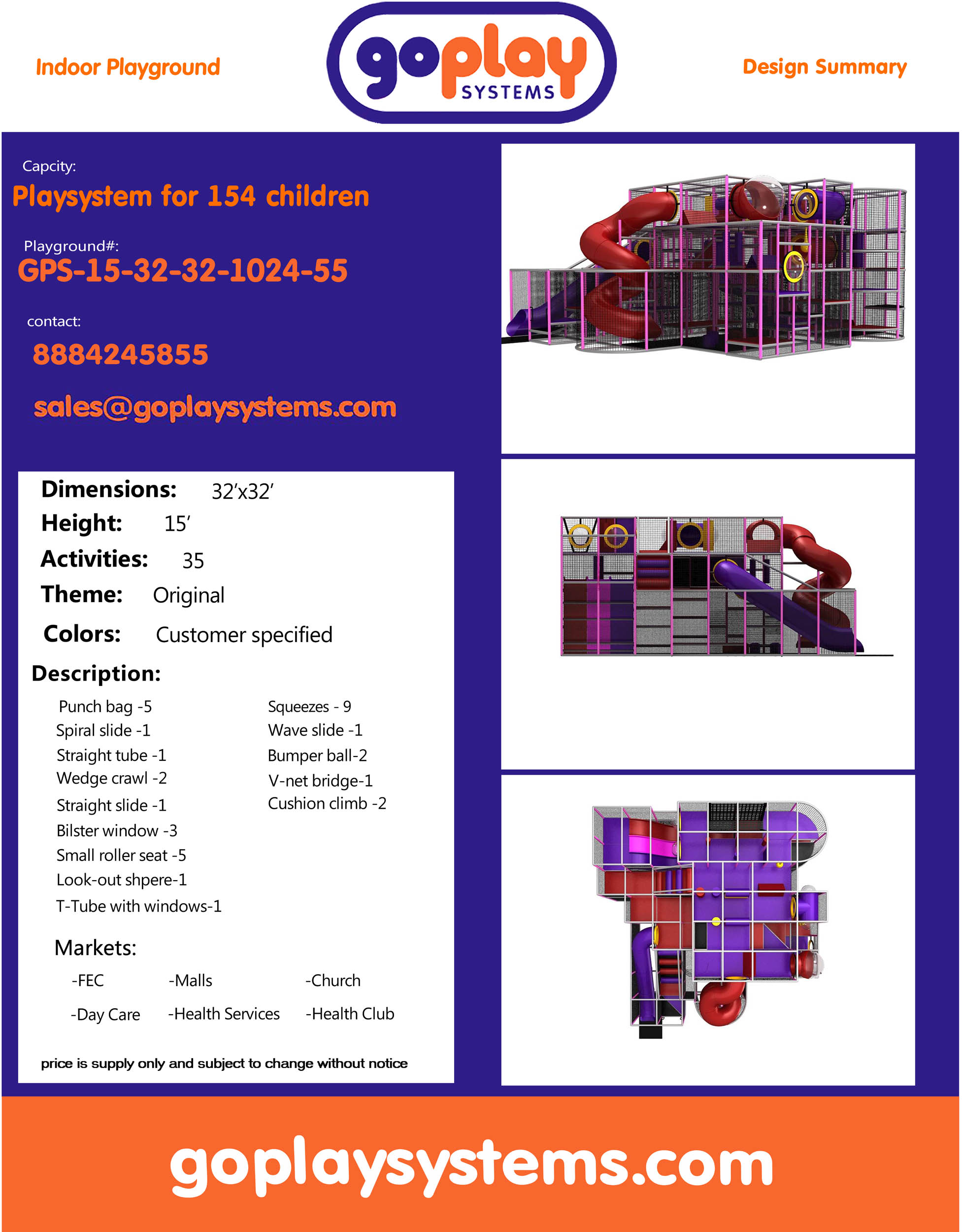 O parque infantil coberto GPS55 é uma estrutura de recreação macia coberta, projetada sob medida para crianças de três a doze anos. O sistema de recreação coberto mede 4,5 m de largura por 9,7 m de altura e 9,7 m de comprimento. O espaço mínimo necessário para este parque infantil coberto é de aproximadamente 7,3 m de largura, 10,3 m de altura e 11,5 m de comprimento. Parque infantil coberto extragrande. Este parque infantil é ideal para edifícios ou armazéns com tetos altos.