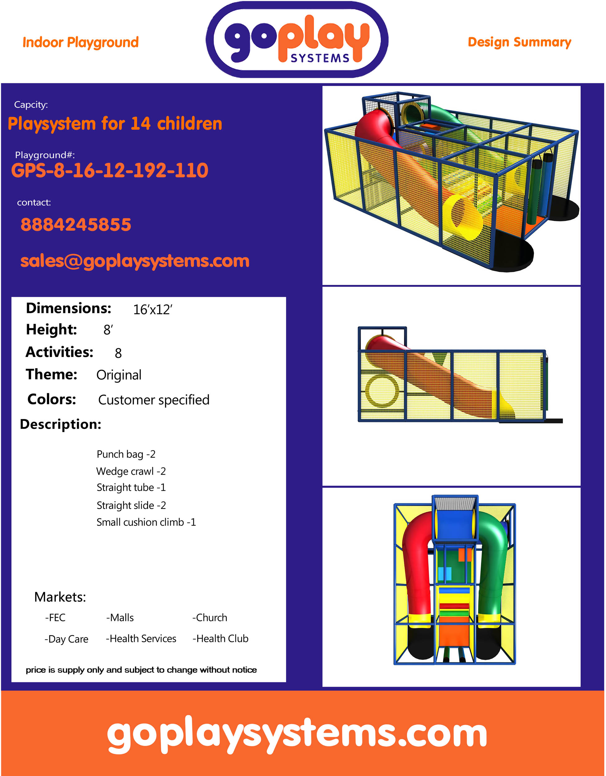 Marca: Go Play Systems SKU: GPS-8-16-12-192-110 Envio: Envio gratuito para os 48 estados contíneos dos EUA Política de envios Política de devoluções e reembolsos