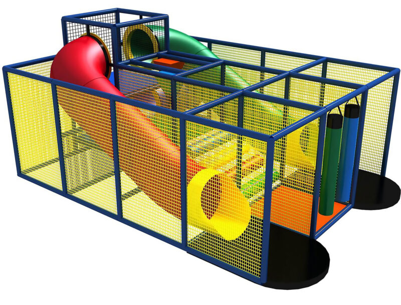 O parque infantil coberto GPS110 é uma estrutura de recreação macia para ambientes internos, projetada especificamente para crianças de três a doze anos. O sistema de brincadeiras interno mede 4,8 m de largura por 2,4 m de altura e 3,6 m de comprimento. O espaço mínimo necessário para este parque infantil interno é de aproximadamente 6,7 m de largura, com pé-direito de 3 m e 5,5 m de comprimento. Parque infantil interno de tamanho pequeno.
