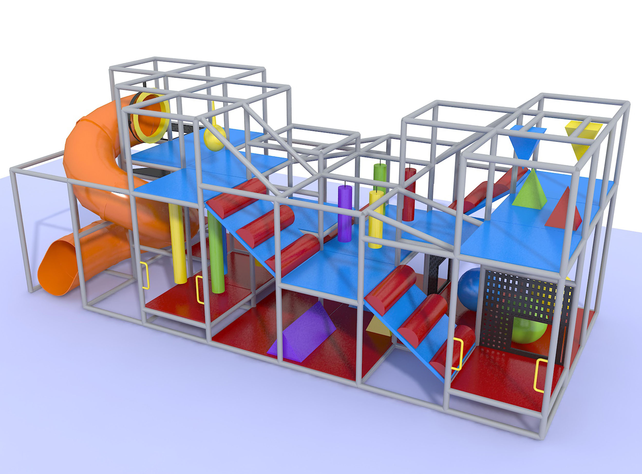 O parque infantil coberto GPS1025 é um sistema modular de brinquedos macios projetado sob medida. O sistema mede 3,35 m de altura x 8,5 m de largura x 3,65 m.