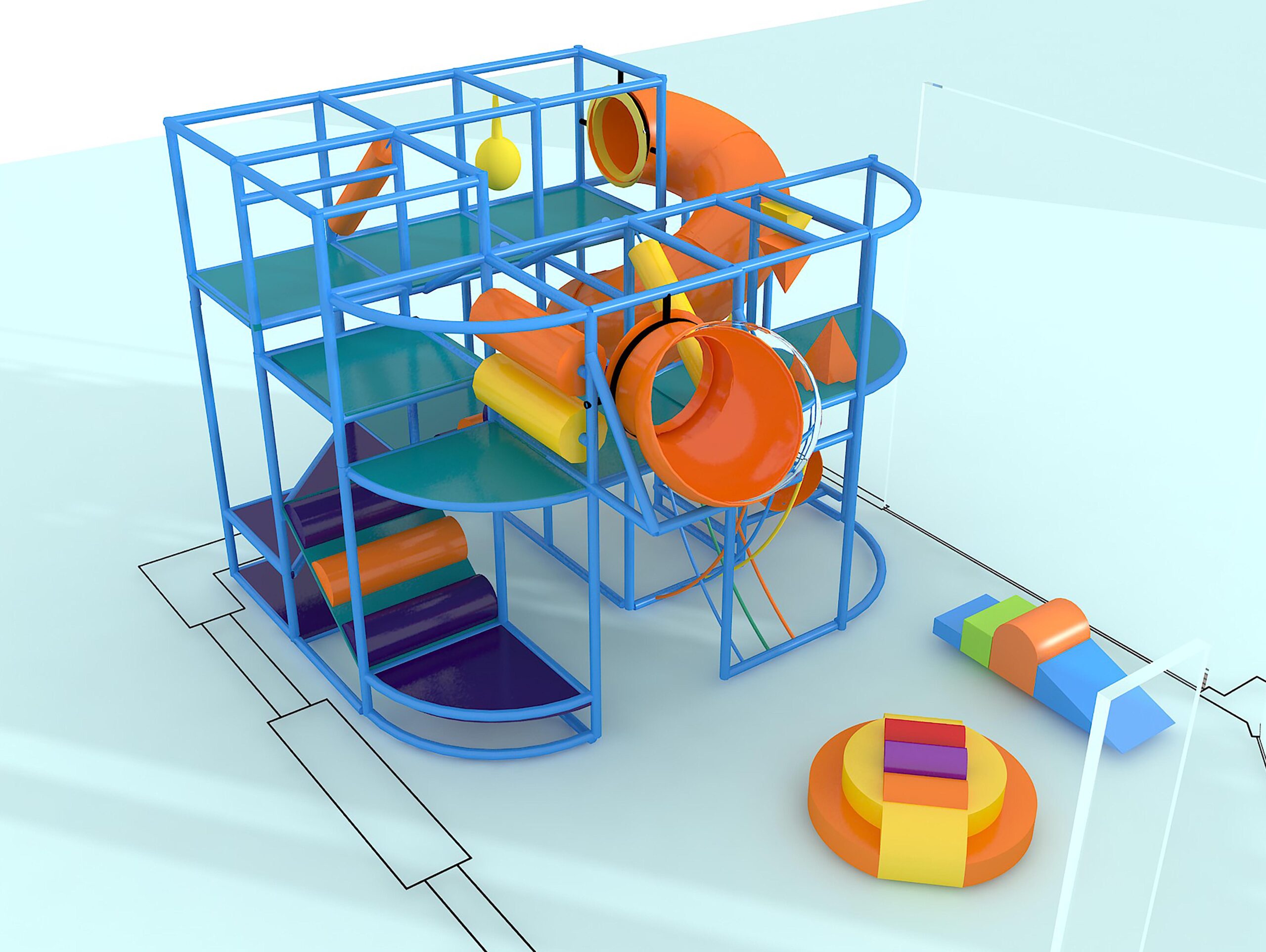 O parque infantil coberto GPS1039 é um sistema modular de brinquedos macios projetado sob medida. O sistema mede 4 m de altura x 4,8 m de largura x 3,6 m.