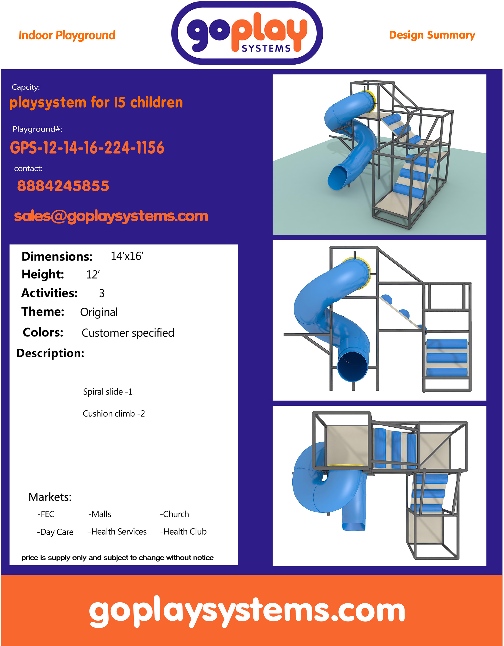 O parque infantil coberto GPS156 é um sistema modular de brinquedos macios, projetado sob medida e desenvolvido para garantir a segurança das crianças. O sistema mede 4,2 m de largura por 3,6 m de altura e 4,8 m de comprimento. O espaço interno mínimo necessário para este parque infantil é de aproximadamente 6,1 m de largura, com pé-direito de 4,2 m e 6,7 m de comprimento. Parque infantil interno de tamanho médio.