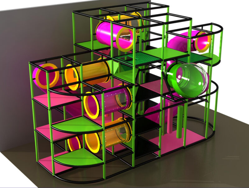 O parque infantil coberto GPS988 é um sistema modular de brinquedos macios projetado sob medida. O sistema mede 4,8 m de altura x 7,3 m de largura x 3,6 m.